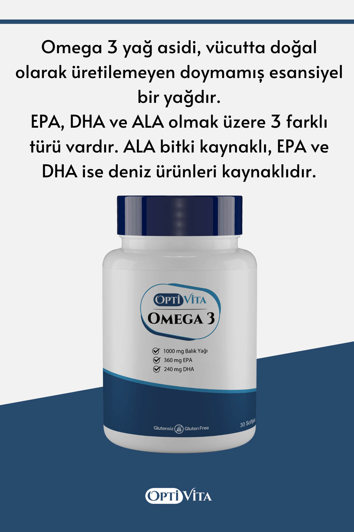Omega 3 yağ asidi, vücutta doğal olarak üretilemeyen doymamış esansiyel bir yağdır. EPA, DHA ve ALA olmak üzere 3 farklı türü vardır. ALA bitki kaynaklı, EPA ve DHA ise deniz ürünleri kaynaklıdır.