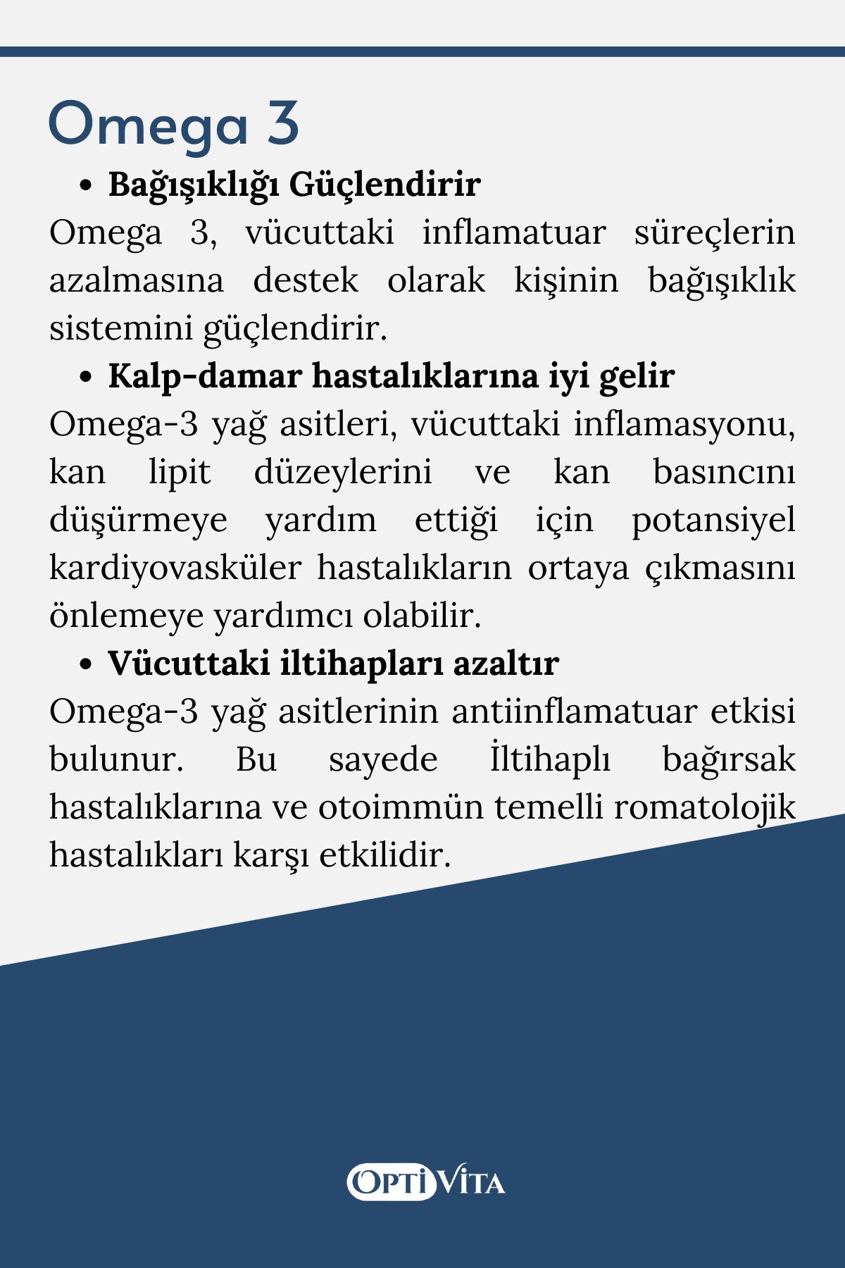 Omega 3, vücuttaki inflamatuar süreçlerin azalmasına destek olarak kişinin bağışıklık sistemini güçlendirir.