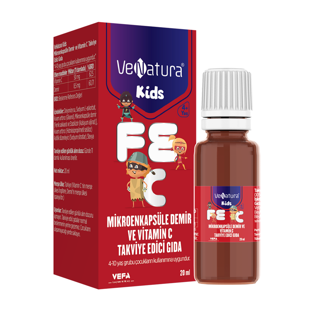 VeNatura Kids Mikroenkapsüle Demir ve Vitamin C Takviye Edici Gıda, çocuklar için Demir ve C Vitamini içeren sıvı takviye edici gıda.